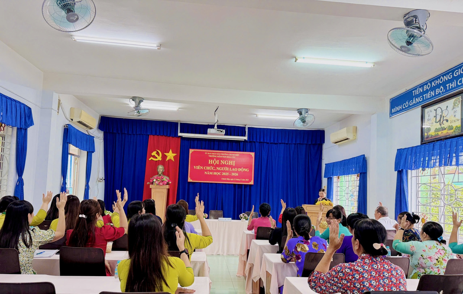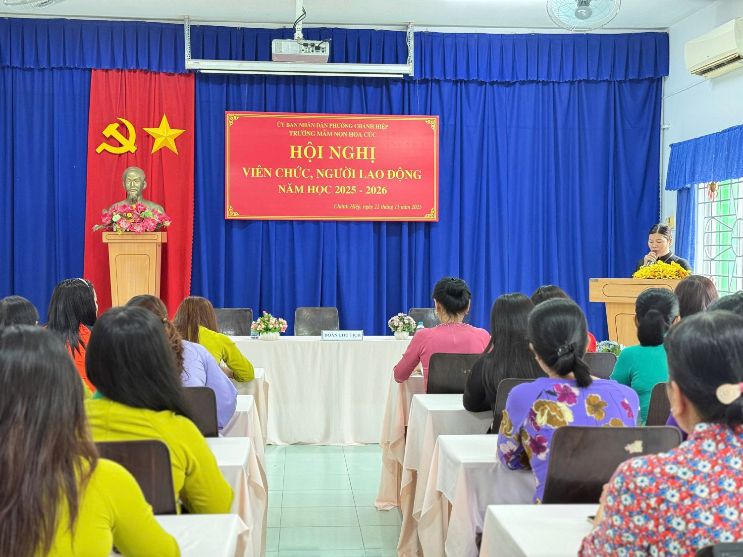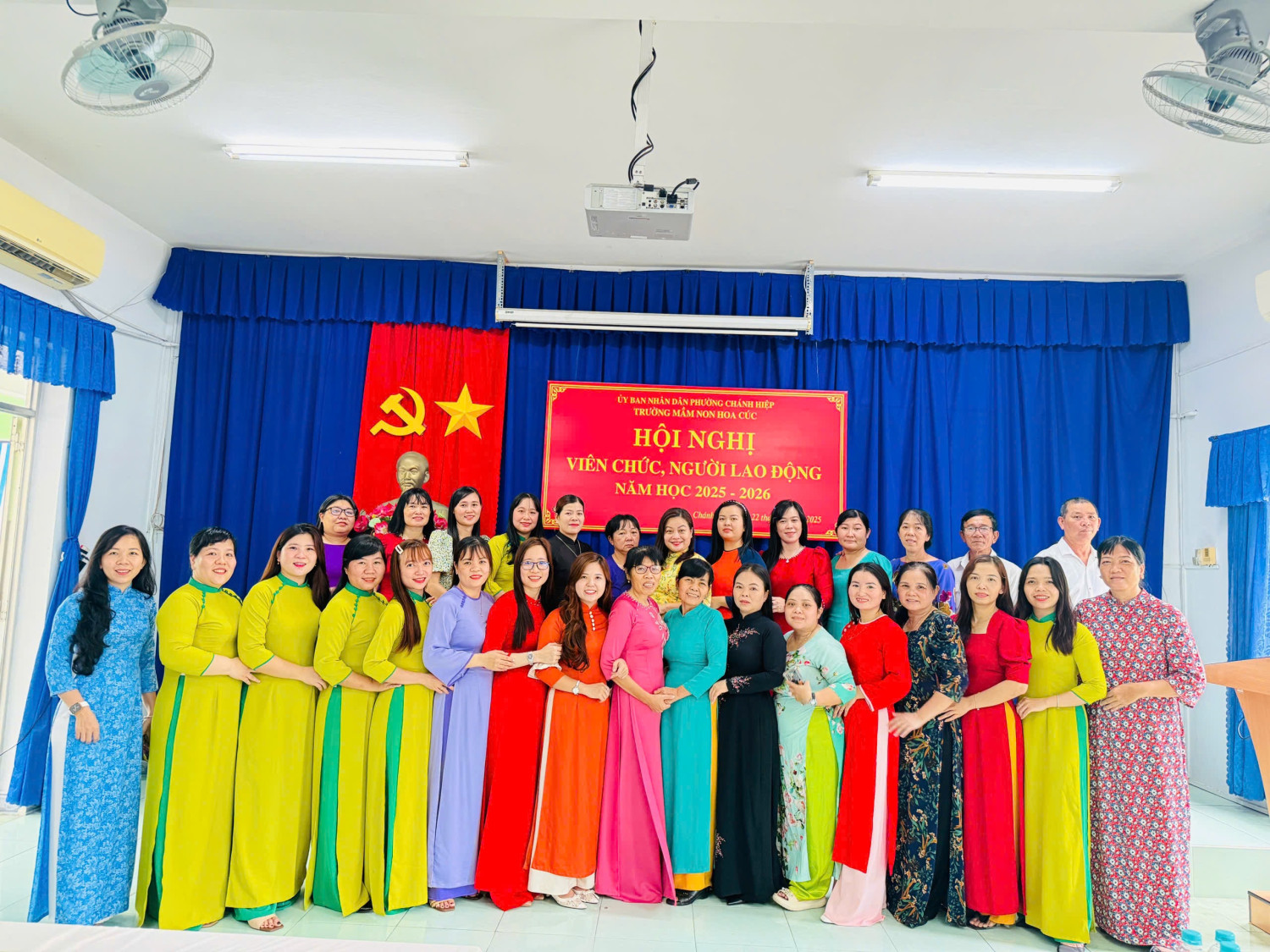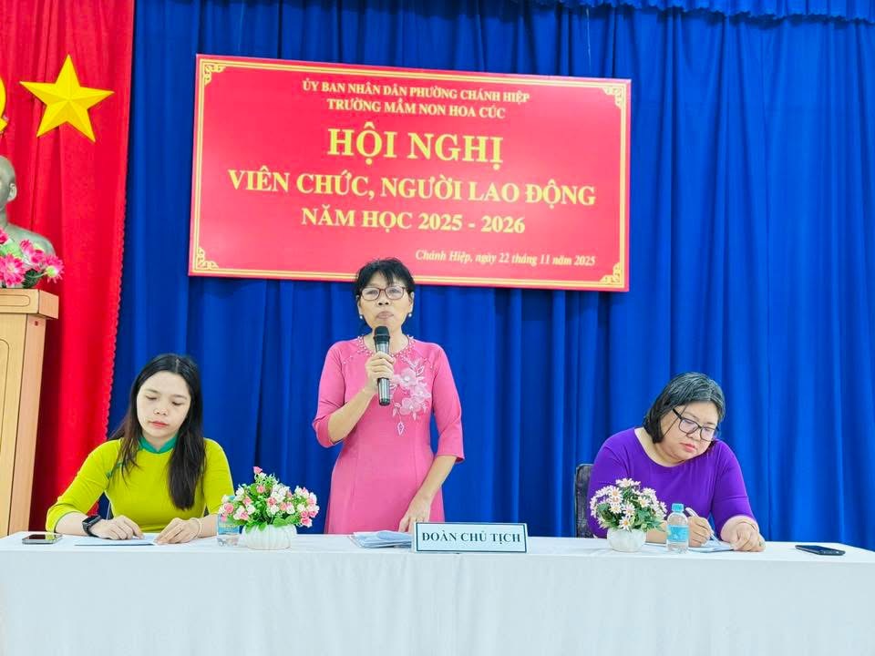 Sáng nay, Ngày 22/11/2025. Trường Mầm non Hoa Cúc đã long trọng tố chức Hội nghị Viên chức - Người lao động năm học 2025 - 2026. Hội nghị nhằm đánh giá kết quả thực hiện nhiệm vụ năm học 2024 - 2025 và thảo luận, thống nhất phương hướng năm học mới năm học 2025 -2026). Tại Hội nghị, Viên chức - NLĐ đã thẳng thắn đóng góp ý kiến xây dựng, thể hiện tinh thần đoàn kết - trách nhiệm