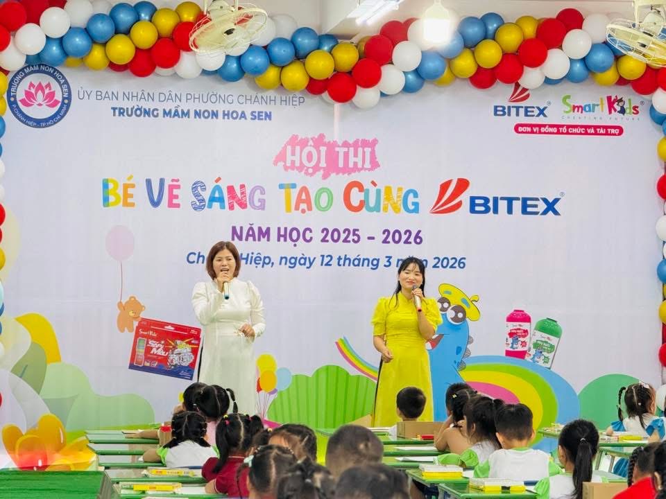 Các bé Trường Mầm non Hoa Cúc đã tích cực tham gia Hội thi "Bé vẽ sáng tạo cùng Bitex" năm học 2025-2026 do Phòng Văn hóa - Xã hội Phường Chánh Hiệp tổ chức. Với sự tự tin, khéo léo và trí tưởng tượng phong phú, các bé đã thế hiện nhiều bức tranh đầy màu sắc, sáng tạo và đáng yêu.