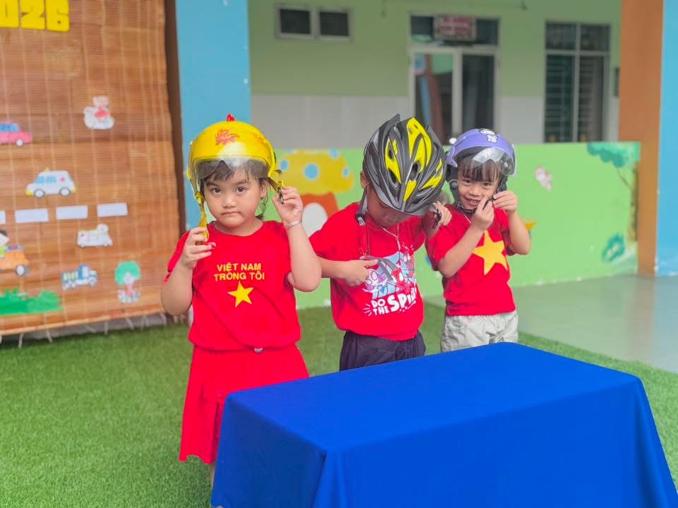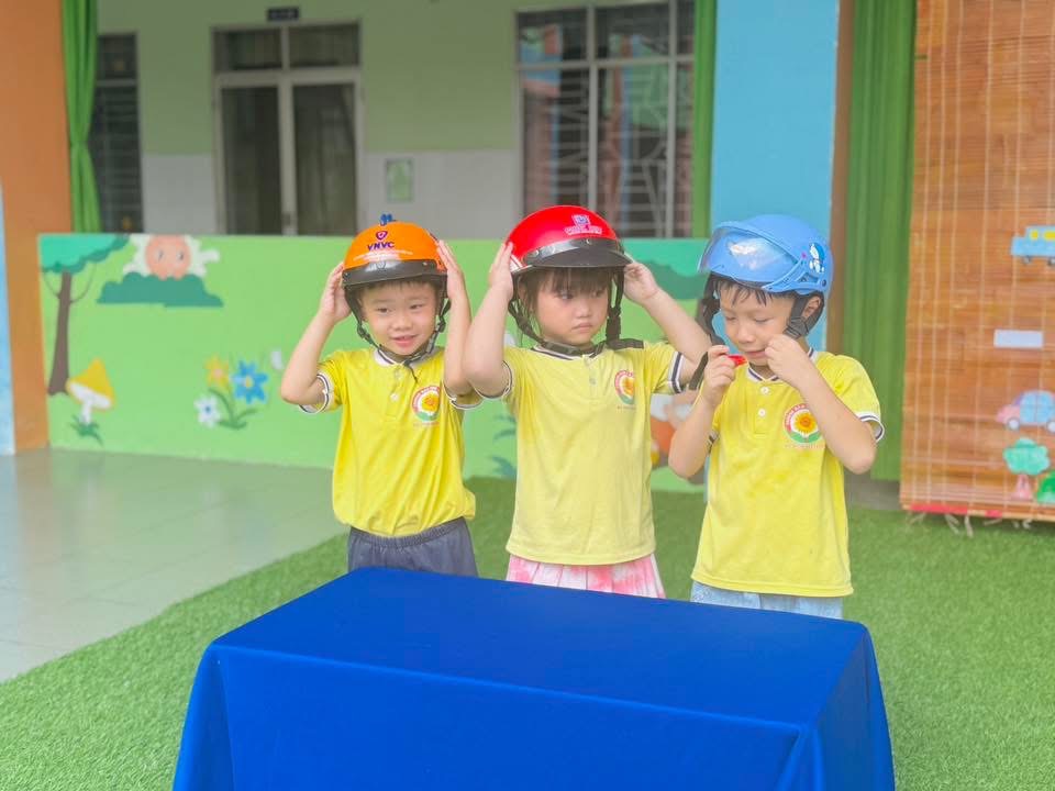 Mở đầu là phần kỹ năng đội nón bảo hiểm đúng cách - các bé thực hiện nhanh nhẹn, gọn gàng, cài quai chắc chắn rất "ra dáng" luôn!
