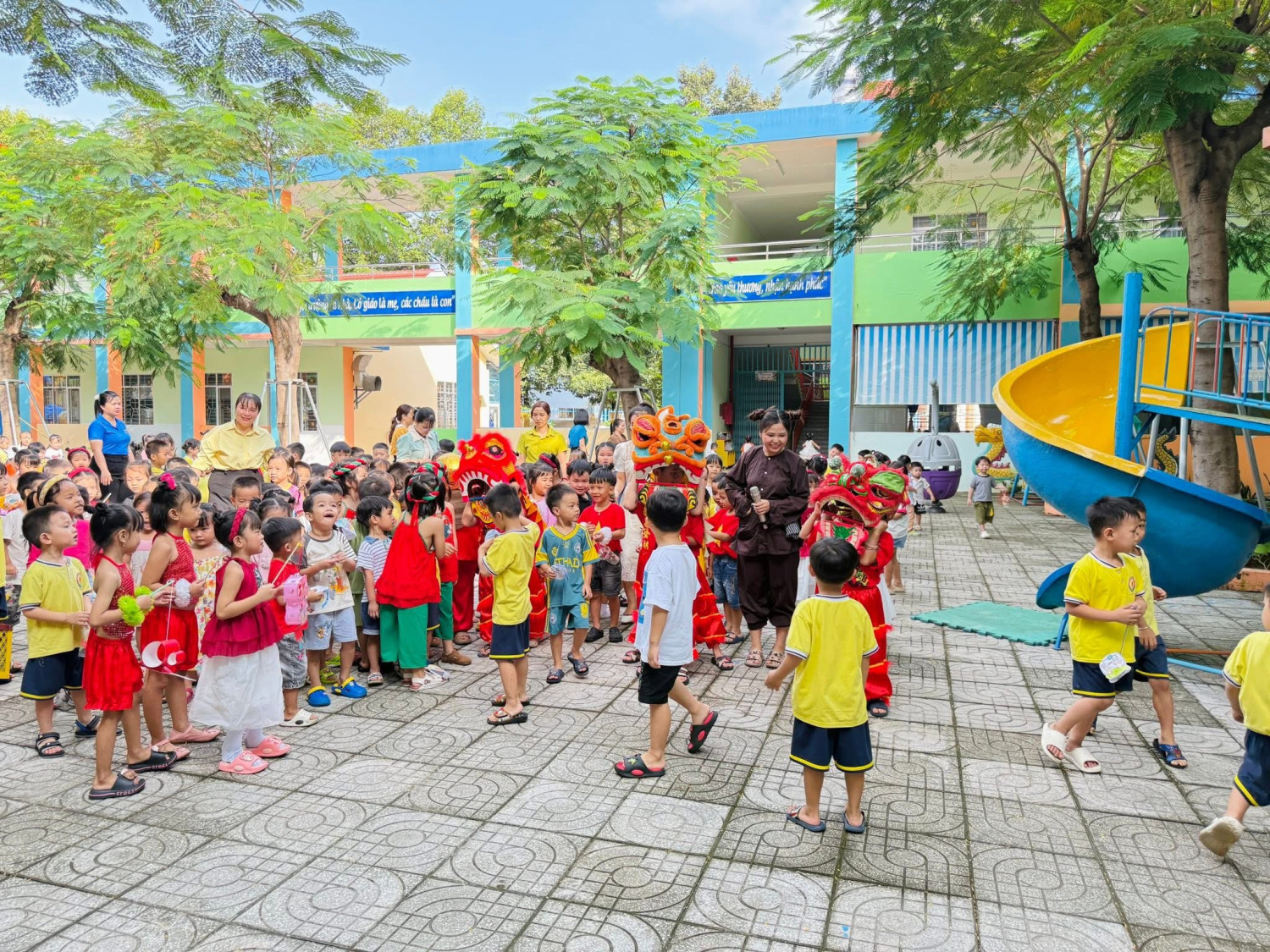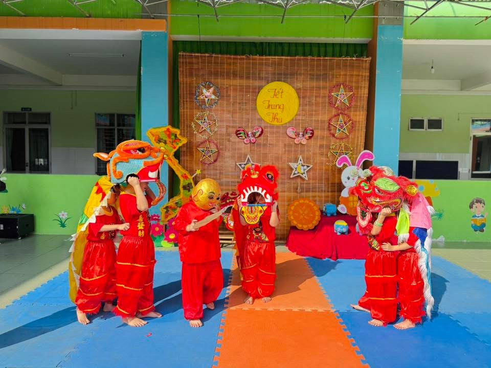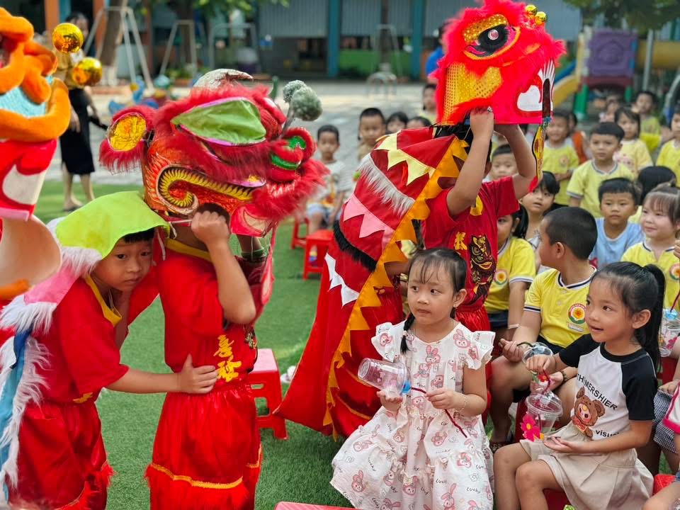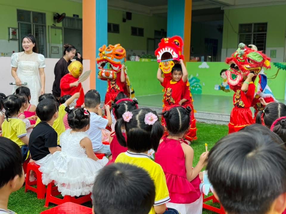 Đặc biệt, phần múa lân do chính các bé đảm nhận khiến không khí thêm sôi động. Tiếng trống lân vang dội, những bước nhảy dứt khoát nhưng đáng yêu, làm cả sân trường như bùng nổ trong niềm vui.