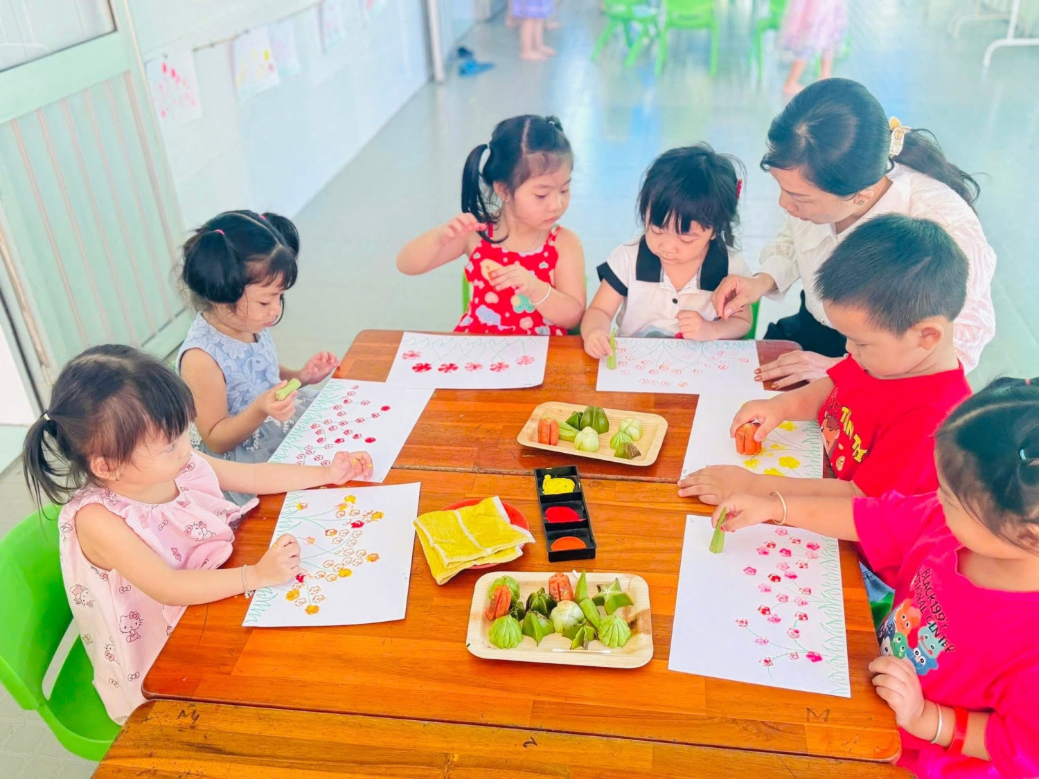 Hoạt động không chỉ giúp các bé rèn luyện sự khéo léo, phát triển khả năng sáng tạo, mà còn giúp trẻ khám phá sự kỳ diệu từ những loại rau củ quen thuộc trong cuộc sống hằng ngày.