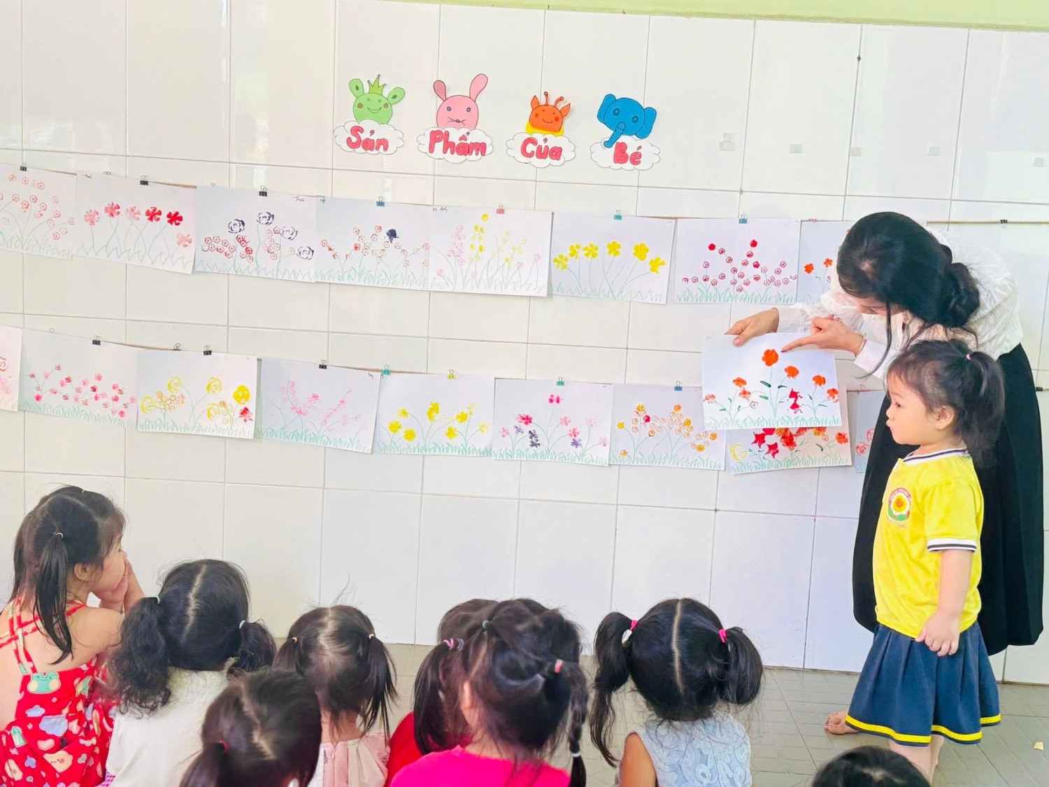 Các bé tham gia rất hào hứng, vui vẻ và thích thú khi được tự tay tạo nên những bông hoa nhiều màu sắc.